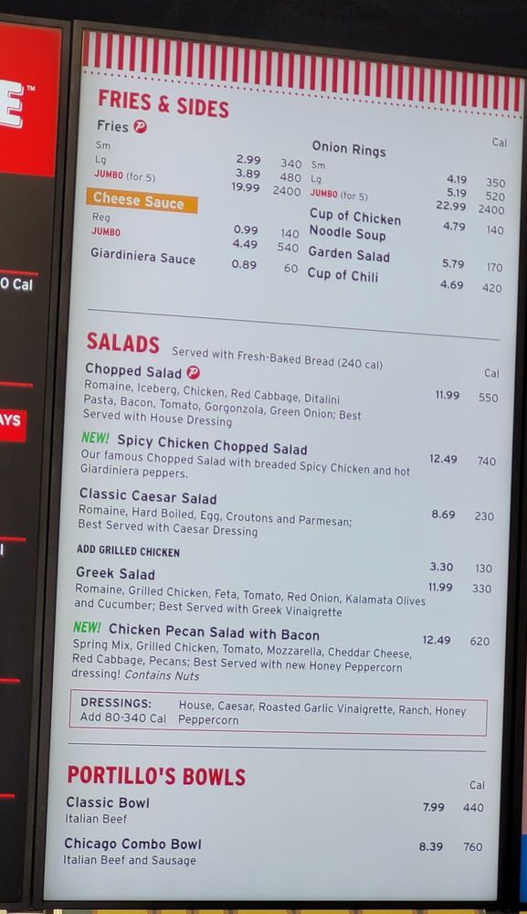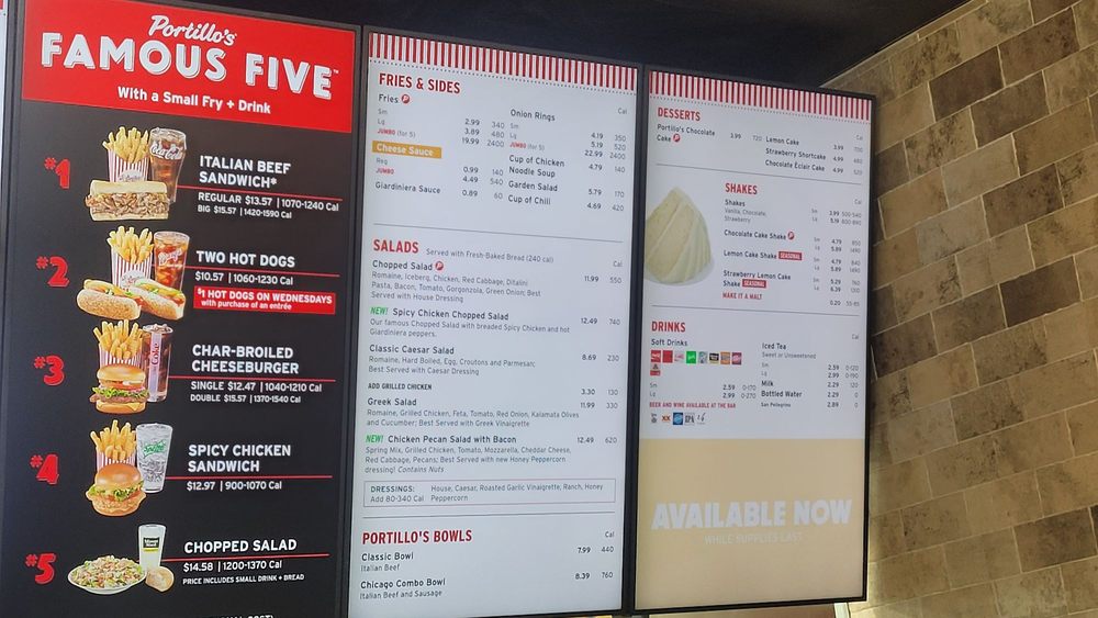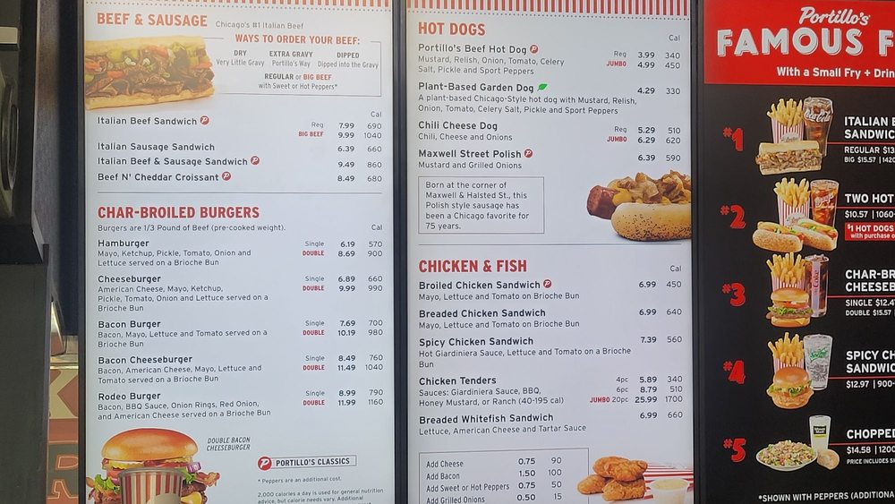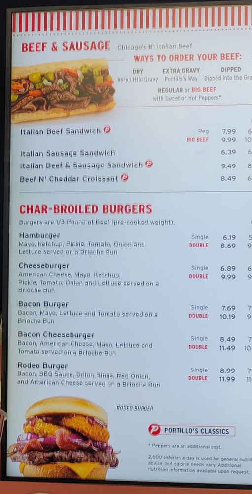 New! Portillo’s classic /-pound char-broiled burger on a Brioche Bun, stacked with new thicker, crispier bacon, thinly-sliced red onion, onion rings, American cheese, and Portillo’s tangy BBQ sauce. Served as a single (pictured) or double.